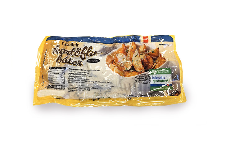 FORSOÐNIR KARTÖFLUBÁTAR 2 x 300g - 5994 Innihald: Kartöflur (93%), repjuolia, hvitlaukur,svartur pipar,steinselja,timían,salt. Næringagildi 100g Orka 589 kj / 141kcal Fita 6,7g Þar af mettuð 0,5g Kolvetni 16g Þar af sykurtegundir 0,8g Trefjar 2,3g Prótein 2,6g Salt 0,04g FORSOÐNAR BÖKUNARKARTÖFLUR Vörunúmer: 5999